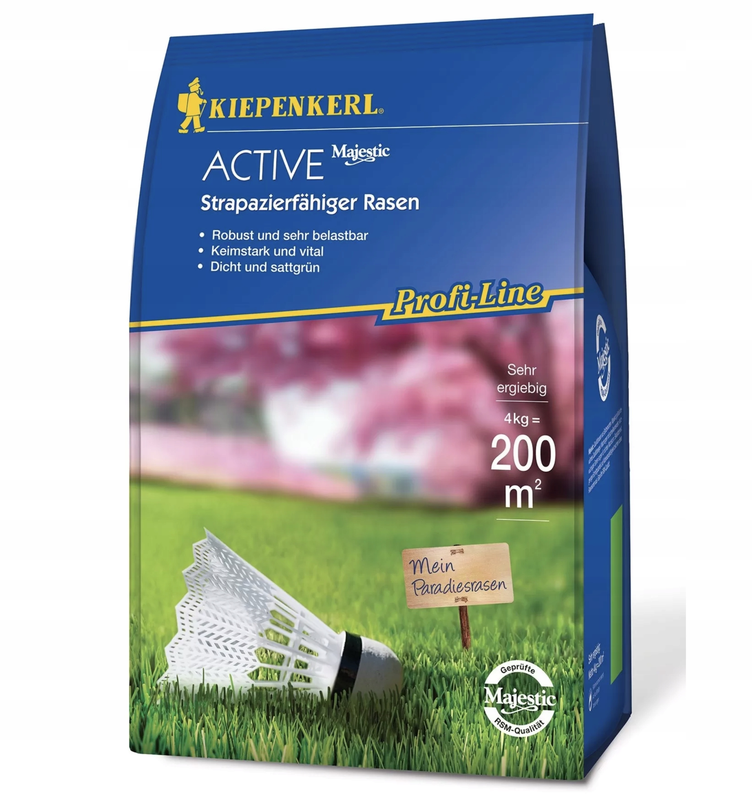 Trawnik "Active" jest bardzo uniwersalny i odporny na użytkowanie. Przeznaczony również na miejsca do uprawiania sportu. Trawa ta jest bardzo trwała i odporna. Dzięki dużej ilości nasion na m² otrzymujemy bardzo gęsty trawnik o pięknym kolorze.