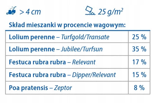 Mieszanka kiełkuje szybko i rozwija mocne i odporne powierzchnie trawnikowe.