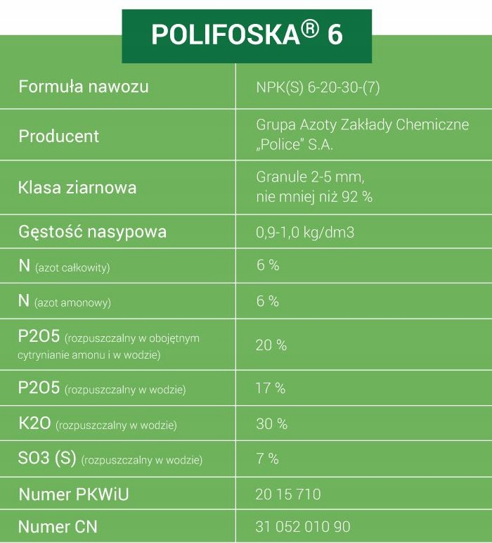 Taki skład chemiczny POLIFOSKI® 6 powoduje dobre ukorzenienie roślin, prawidłowy, proporcjonalny ich rozwój od okresu powschodowego, zwiększa odporność roślin, a stosowany przedsiewnie zwiększa ich mrozoodporność, odporność na susze, wpływa także na pełne kwitnienie i równomierne dojrzewanie oraz na poprawę jakości i wierny, wysoki plon.