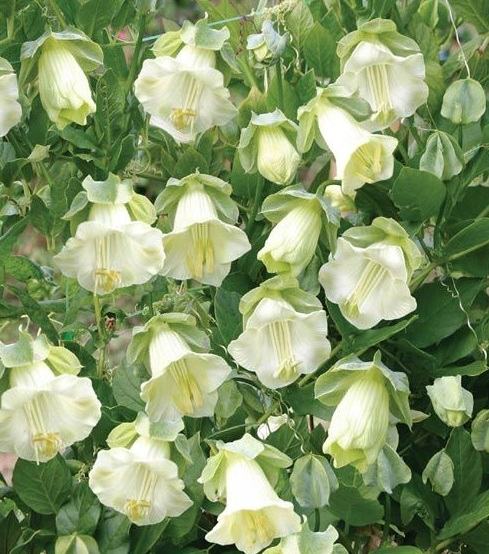 Bardzo atrakcyjne, okazałe pnącze jednoroczne (2-3 m). Kwiaty duże, dzwonkowate, biało-kremowe, osadzone na długich szypułkach. Bardzo szybko rozrasta się i doskonale pokrywa ogrodzenia, ściany altan, pergole, balkony. Nasiona przed siewem moczyć w letniej wodzie ok. 2godz. Wysiew pod osłony późną zimą lub wczesną wiosną. Optymalna temp. 18-24oC. Podłoże żyzne, umiarkowanie wilgotne. Nasiona wschodzą 21-30 dni.